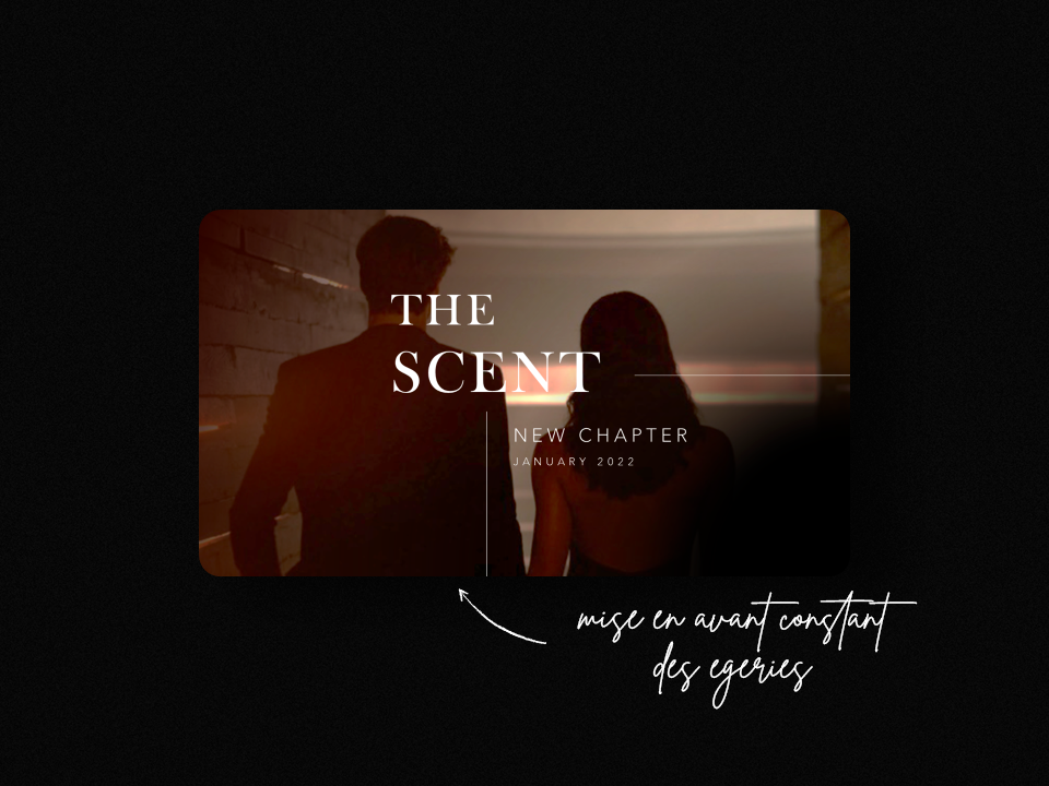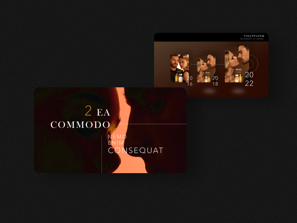 Pour le lancement du parfum The Scent, BOSS a misé sur une stratégie d'égéries incarnée par le couple formé par Laura Harrier et Jacob Elordi. Une série de slides élégantes et captivantes ont été créées, respectant un langage graphique dominé par des teintes chaudes, tamisées et ambrées. Le projet s’est concentré sur la mise en scène du duo à travers un storytelling visuel percutant, tout en respectant les codes graphiques de BOSS. L’objectif était de renforcer l'identité et la narration de cette nouvelle campagne publicitaire.
